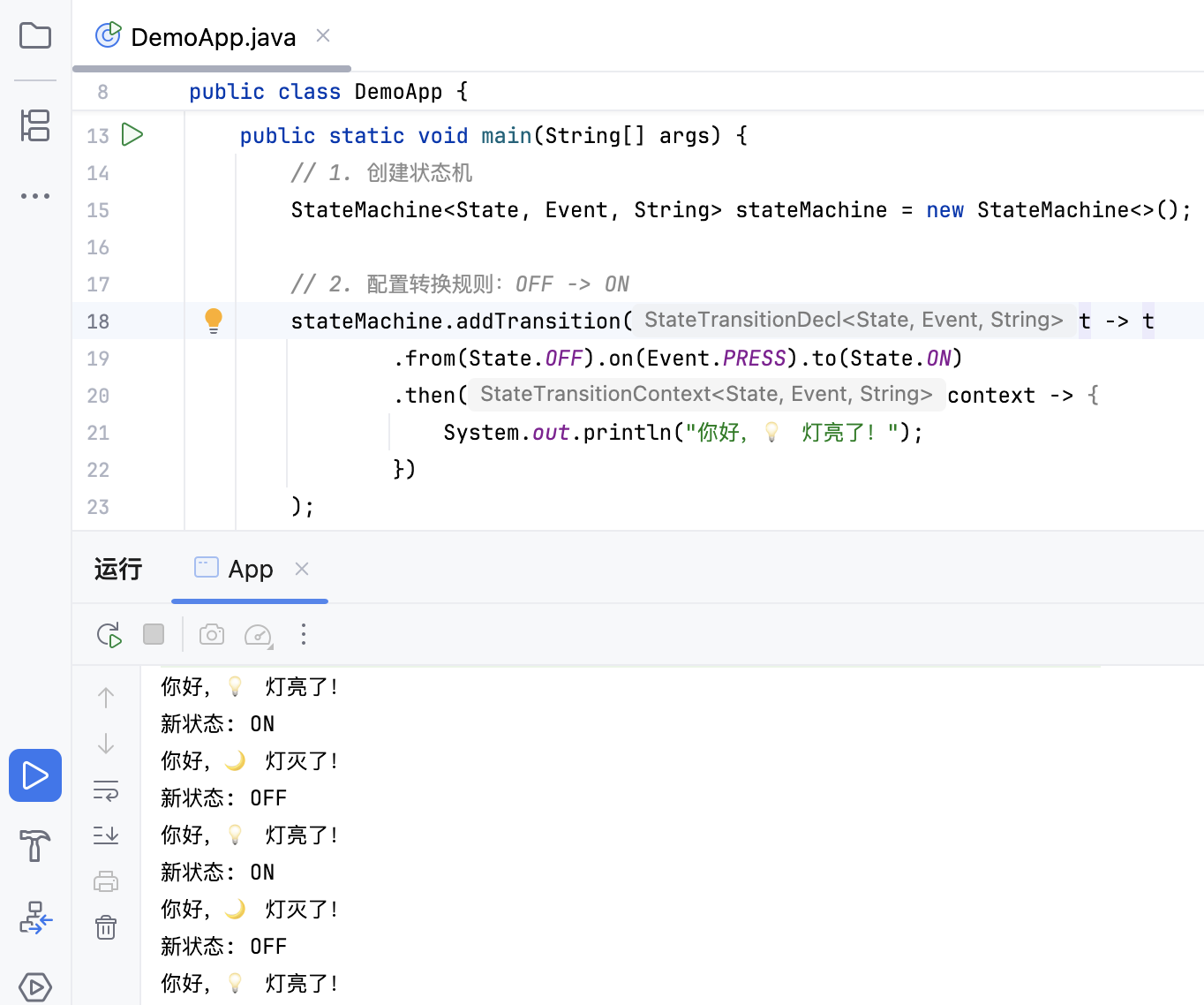 stateMachine.addTransition(t -> t.from(State.OFF).on(Event.PRESS).to(State.ON)