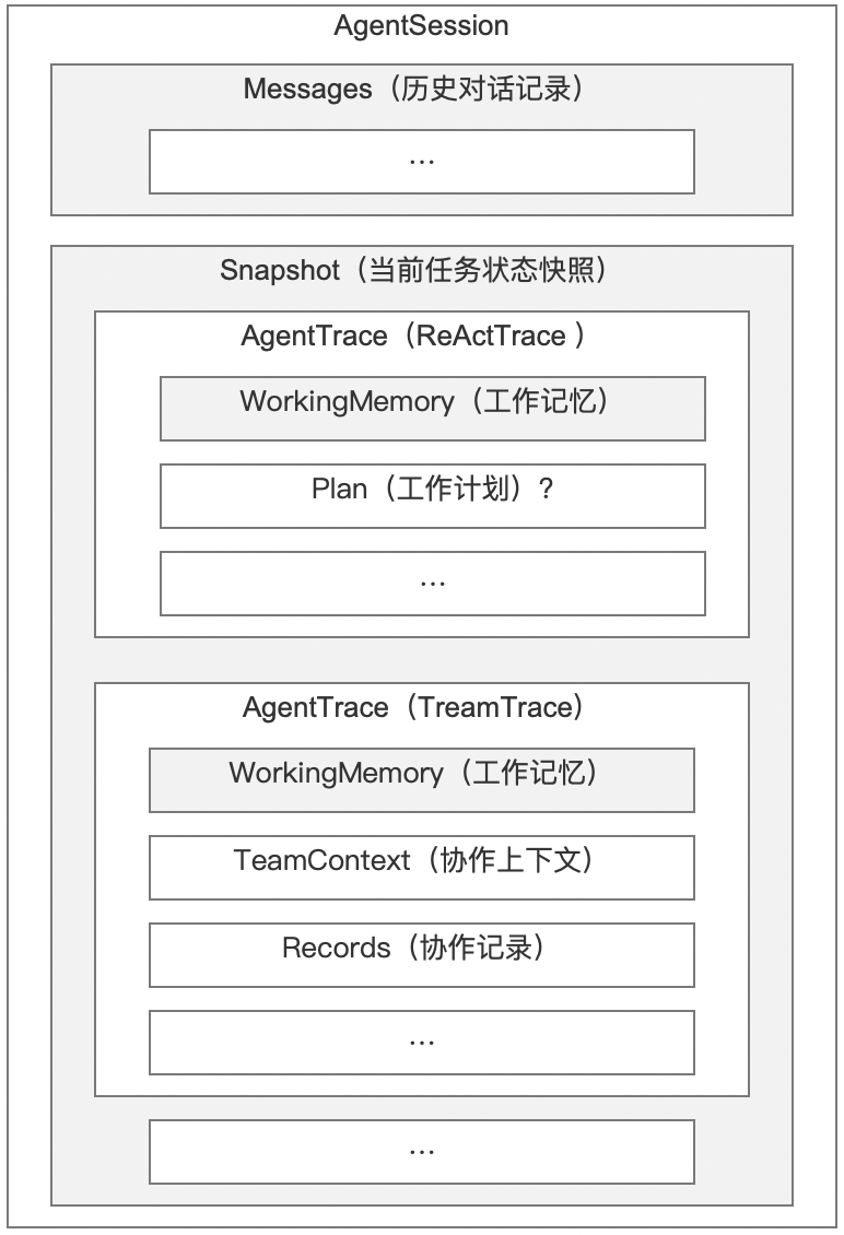 | 历史对话记录(Messages) | SimpleAgent ReActAgent TeamAgent | 跨任务记忆:由 ChatMessage 列表组成。记录多次完整的人机交互历程。一次记录包含“用户提问”到“Agent 最终答复”的完整闭环。 |
