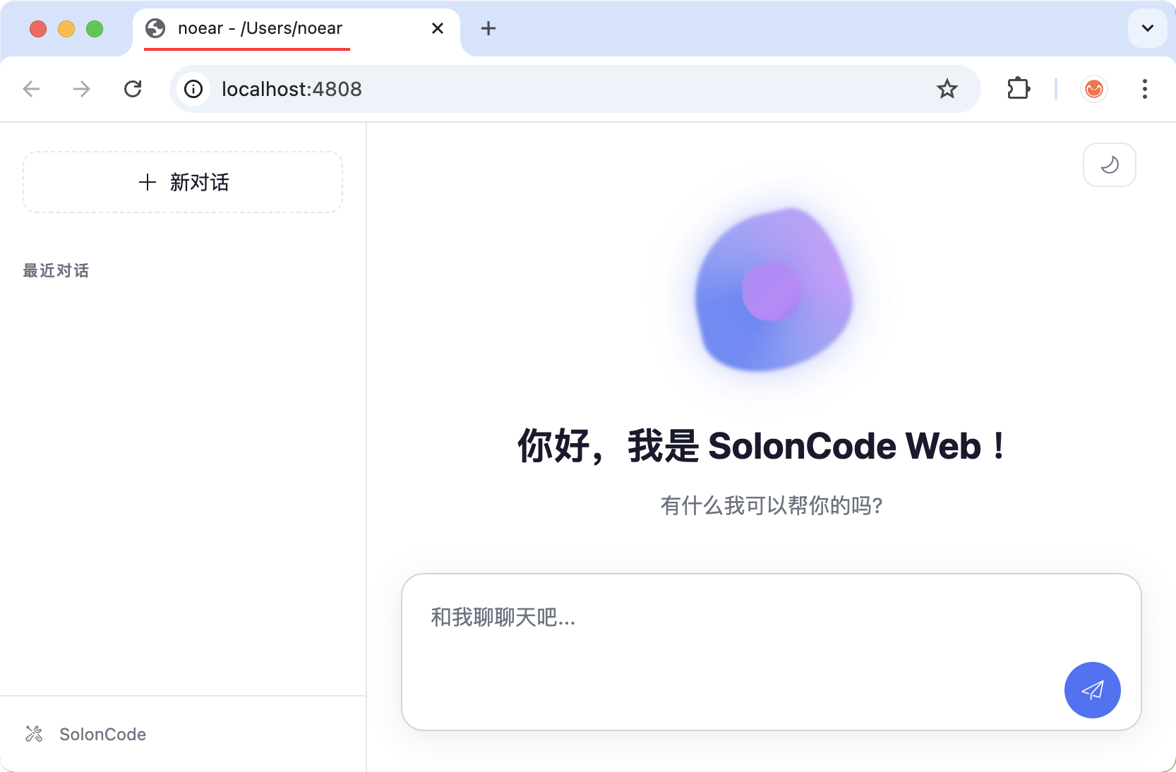 SolonCode 启动 Web 交互模式。启动时,浏览器的 tab 显示为工作区名与路径。